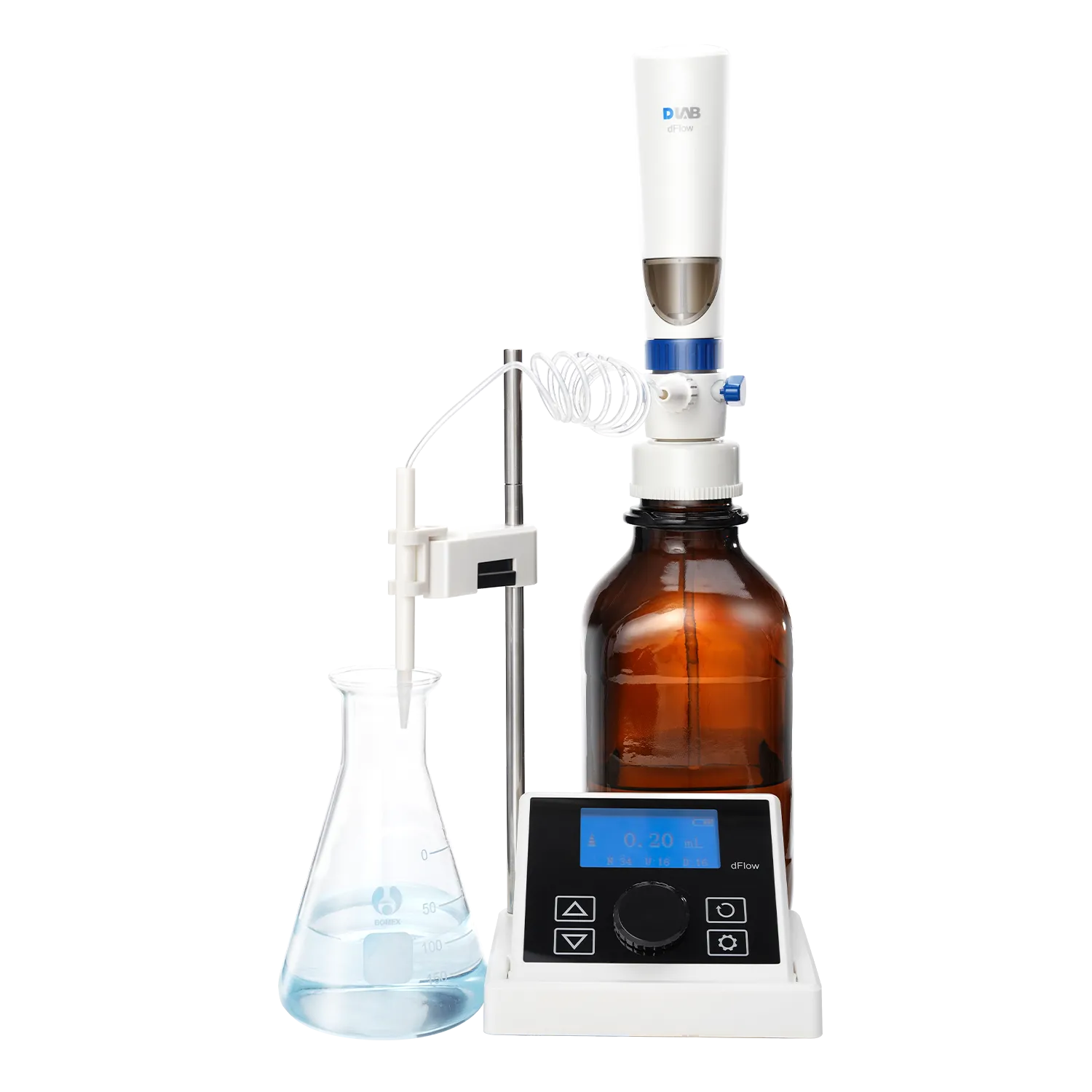 The dFlow Electronic Bottle-Top Dispenser by DLAB Scientific is a high-performance, motorized dispensing system designed for precise, repeatable, and contamination-free liquid dispensing. With a wide volume range of 0.1 to 99.9 mL, it supports both large-volume transfers and micro-dosing needs. Its 10 mL piston lift and 100 μL resolution ensure fine control over dispensed volume. The device features external remote control for hands-free operation, reducing fatigue and contamination risks.